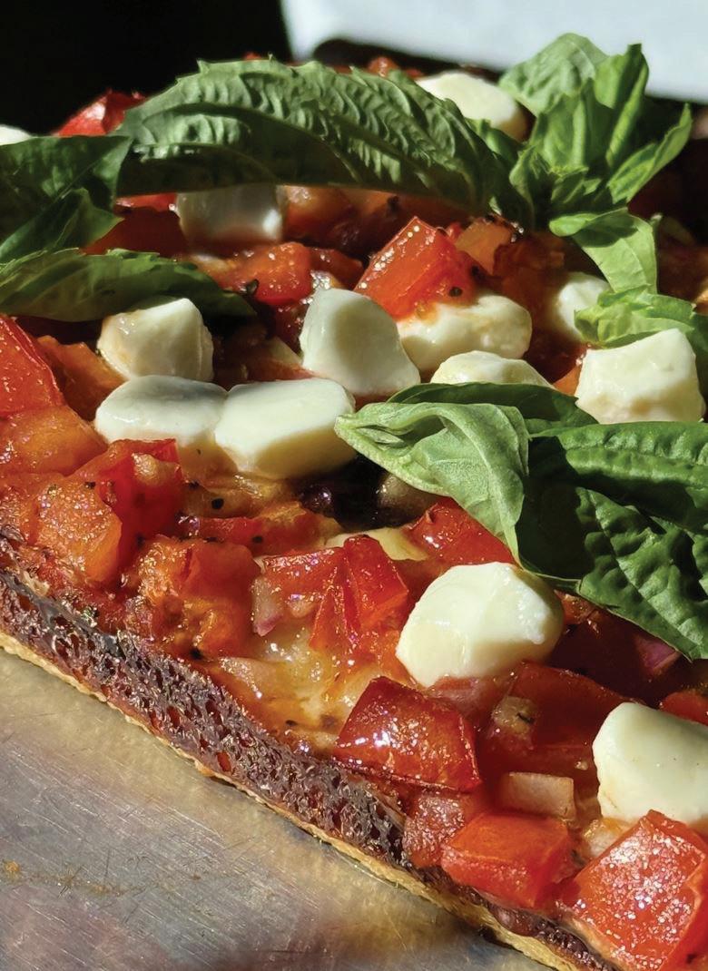 A roasted garlic & fresh tomato base layered with salami and pepperoni, fire-roasted grape tomatoes, and a trio of cheeses: whole-milk mozzarella, fresh fior di latte, and rich dollops of ricotta. Finished with just a whisper of red pepper flakes, baked on our 100% stone deck, then crowned with a drizzle of local hive honey and organic basil.