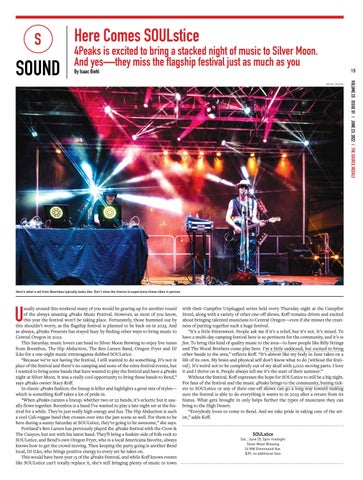 with their Campfire Unplugged series held every Thursday night at the Campfire Hotel, along with a variety of other one-off shows. Koff remains driven and excited about bringing talented musicians to Central Oregon—even if she misses the craziness of putting together such a huge festival. “It’s a little bittersweet. People ask me if it’s a relief, but it’s not. It’s mixed. To have a multi-day camping festival here is so pertinent for the community, and it’s so fun. To bring this kind of quality music to the area—to have people like Billy Strings and The Wood Brothers come play here. I’m a little saddened, but excited to bring other bands to the area,” reflects Koff. “It’s almost like my body in June takes on a life of its own. My brain and physical self don’t know what to do [without the festival]. It’s weird not to be completely out of my skull with 5,000 moving parts. I love it and I thrive on it. People always tell me it’s the start of their summer.” Without the festival, Koff expresses the hope for SOULstice to still be a big night. For fans of the festival and the music 4Peaks brings to the community, buying tickets to SOULstice or any of their one-off shows can go a long way toward making sure the festival is able to do everything it wants to in 2023 after a return from its hiatus. What gets brought in only helps further the types of musicians they can bring to the High Desert. “Everybody loves to come to Bend. And we take pride in taking care of the artist,” adds Koff. SOULstice