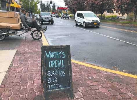 The Downtown Bend Business Association worked during lockdown to help its members change their business models and sell products online. Here, a DBBA staffer puts up new banners encouraging people to shop local.