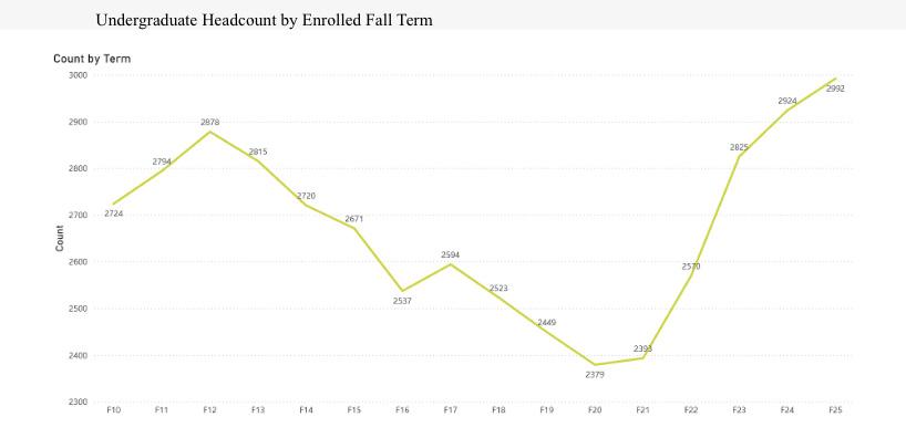 When combining both undergraduate and graduate students, total enrollment for the Fall 2025 semester stands at 3,346, surpassing the previous record of 3,301 students in Fall 2012. These totals represent Southern’s raw headcount, meaning that they include anyone registered in at least one