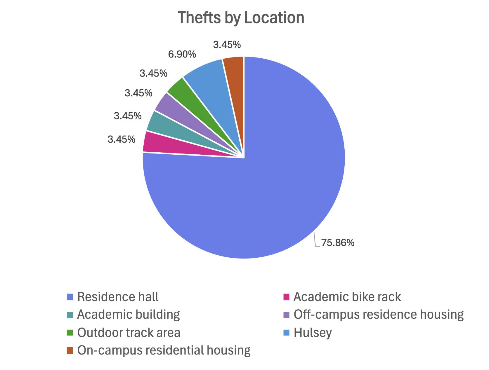 Approximately 75.86% of reported campus thefts occurred in residence hall dorm rooms, laundry rooms, and storage areas combined. Single incidents at an academic bike rack, academic building, off-campus residence housing, on-campus residential housing and the outdoor track each accounted for 3.45%. Thefts at Hulsey made up 6.90% of total cases.