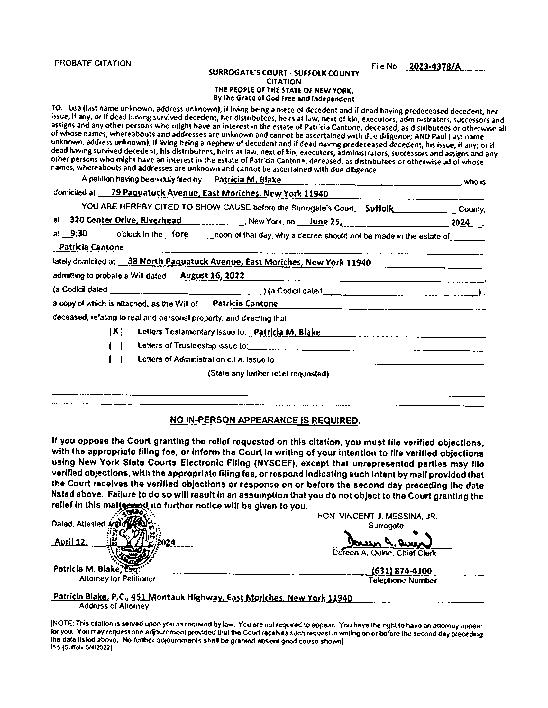 OR ASSIGNS, AS COMMISSIONER OF SOCIAL SERVICES OF SUFFOLK COUNTY; THE NEW YORK STATE AFFORDABLE HOUSING CORPORATION, A PUBLIC BENEFIT CORPORATION , CREATED AND EXISTING AS A SUBSIDIARY OF THE NEW YORK STATE HOUSING FINANCE AGENCY; TOWN OF BROOKHAVEN; STATE OF NEW YORK; UNITED STATES OF AMERICA; NEW YORK STATE DEPARTMENT OF TAXATION AND FINANCE; TOWN OF BROOKHAVEN ;and JOHN DOE AND JANE DOE #1 through #7, the last seven (7) names being fictitious and unknown to the Plaintiff, the persons or parties intended being the tenants, occupants, persons or parties, if any, having or claiming an interest in or lien upon the mortgaged premises described in the Complaint, Defendants. INDEX # 603319/2022 Original filed with Clerk February 23, 2022. Plaintiff Designates Suffolk County as the Place of Trial. The Basis of Venue is that the subject action is situated Suffolk County. Premises: 39 Moriches Middle Island Road, Shirley, NY 11967. TO THE ABOVE-NAMED DEFENDANTS: YOU ARE HEREBY SUMMONED to answer the Complaint in this action and to serve a copy of your answer, or, if the Complaint is not served with this Summons, to serve a notice of appearance, on the Plaintiff’s Attorney(s) within 20 days after the service of this Summons, exclusive of the day of service (or within 30 days after the service is complete if this Summons is not personally delivered to you within the State of New York); the United States of America may appear or answer within 60 day of service hereof; and in case of your failure to appear or answer, judgment will be taken against you by default for the relief demanded in the Complaint. This supplemental summons and amended complaint are being filed pursuant to court order dated March 29, 2024. NOTICE YOU ARE IN DANGER OF LOSING YOUR HOME If you do not respond to this Summons and