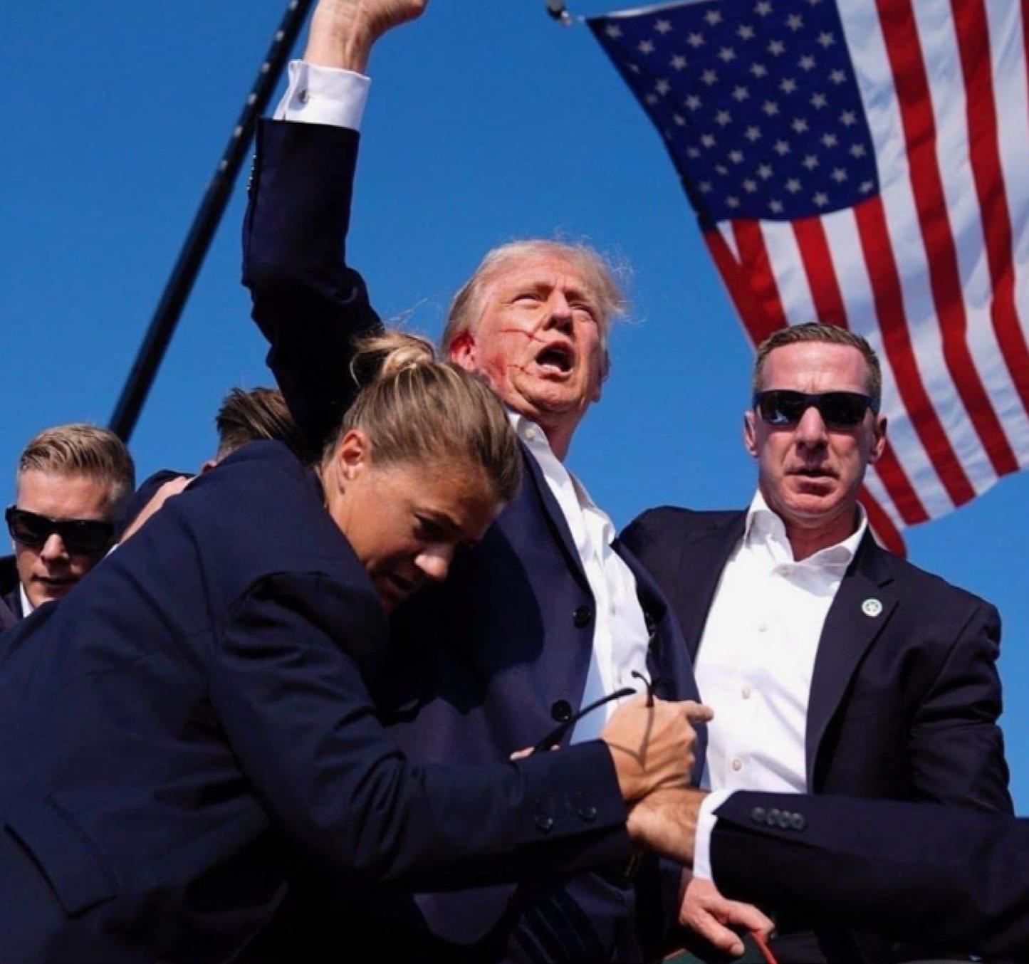 PRESIDENT TRUMP FEARLESSLY PUMPS HIS FIST IN THE AIR AFTER AN ASSASSIN’S BULLET NEARLY KILLED HIM DURING A CAMPAIGN RALLY.