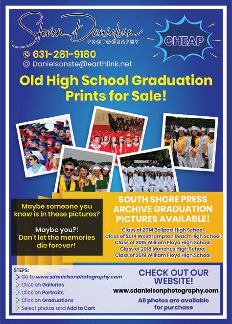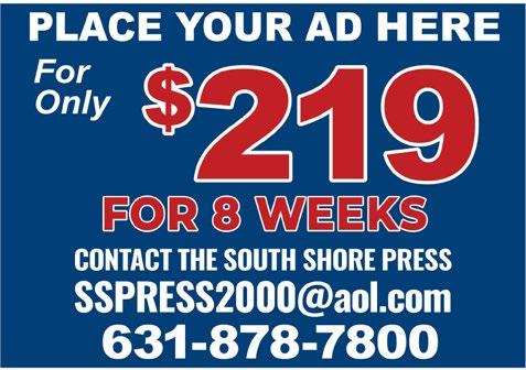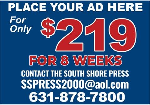 Copyright© 2022 South Shore Press, Inc. All rights reserved. Material appearing herein may not be published, broadcast, rewritten or redistributed in any form. Copying part or all of the editorial or graphic arts in any machinereadable form, making multiple printouts thereof or other uses of the work product contained herein is expressly prohibited and is inconsistent with all applicable copyright laws. Advertisers purchase space and circulation only. All property rights to any advertisements produced for the advertisers by South Shore Press, Inc. using art work and/or typography furnished or arranged by South Shore Press, Inc. shall be the property of South Shore Press, Inc. No such ad or any part thereof may be reproduced or assigned without the express written consent of South Shore Press, Inc. South Shore Press, Inc. assumes no financial responsibility for errors beyond the cost of the actual space occupied by the error. Postmaster: Send address changes to P.O. Box 431, Shirley, N.Y. 11967.