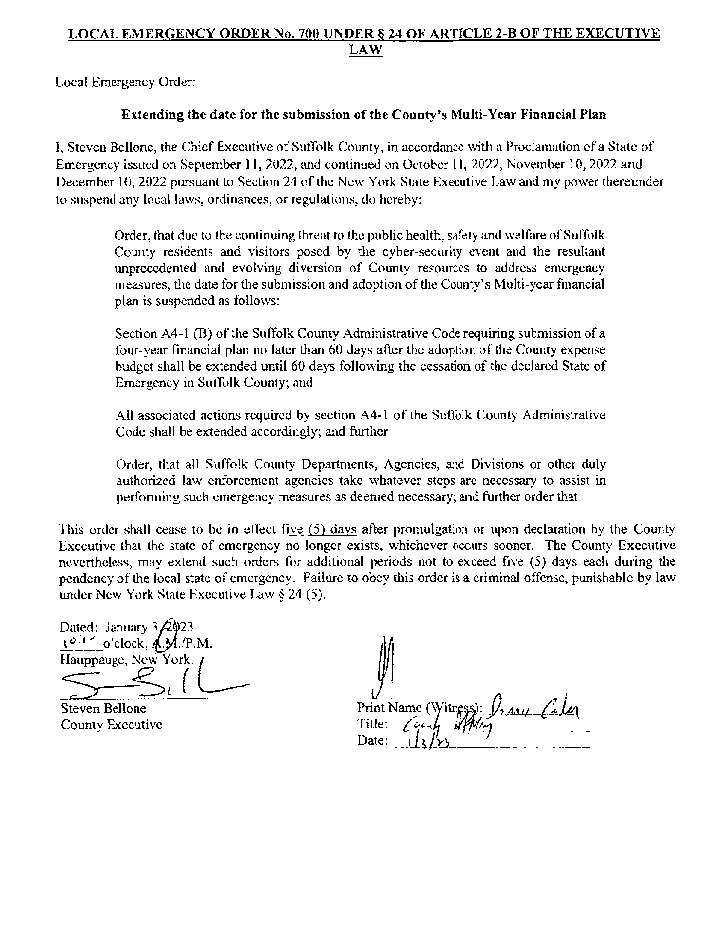 LOCAL EMERGENCY ORDER No. 699, EXTENDING LOCAL EMERGENCY ORDER Nos. 666, 671, 676, 681, 687 and 693 UNDER § 24 OF ARTICLE 2-B OF THE EXECUTIVE LAW