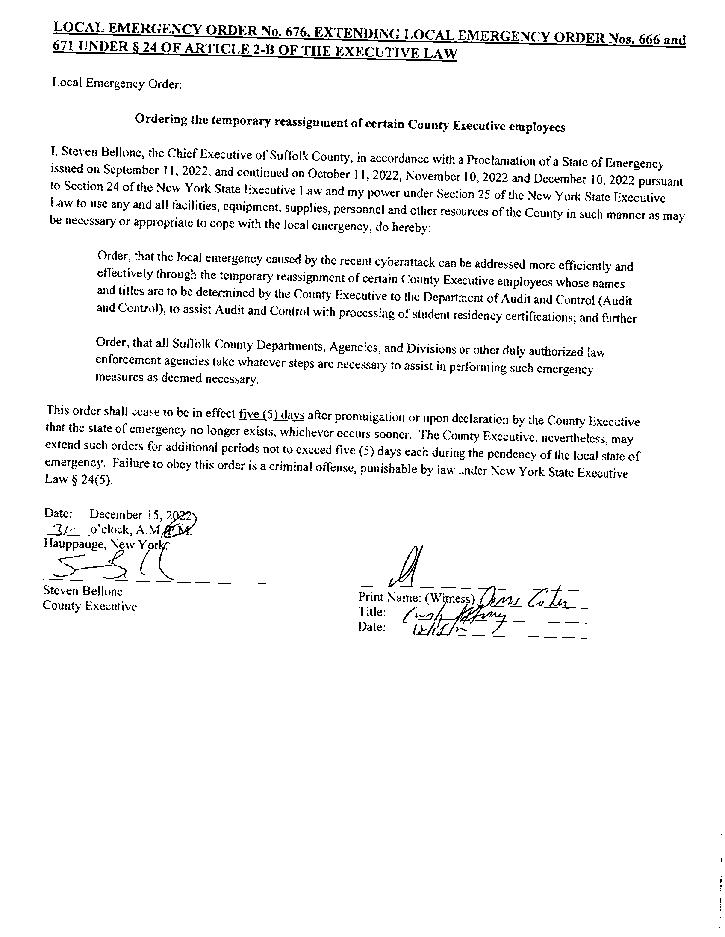 I, Steven Bellone, the Chief Executive of Suffolk County, in accordance with a Proclamation of a State of Emergency issued on September 11, 2022, and continued on October 11, 2022 and November 10, 2022 pursuant to Section 24