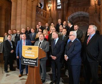 “Pump the Brakes” was the message state legislators sent to Gov. Hochul Monday in asking her to put off forcing school buses to be electrified until a taxpayer impact study is completed. They were joined by school administrators and transportation experts who expressed concerns about the unrealistic and costly requirements of the state mandate.
