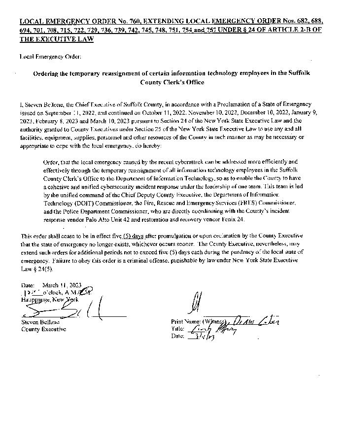 I, Steven Bellone, the Chief Executive of Suffolk County, in accordance with a Proclamation of a State of Emergency issued on September 11, 2022, and continued on October 11, 2022, November 10, 2022, December 10, 2022, January 9, 2023, February 8, 2023 and March 10, 2023 pursuant to Section 24 of the New York State Executive Law and the authority granted to County Executives under Section 25 of the New York State Executive Law to use any and all facilities, equipment, supplies, personnel and other resources of the County in such manner as may be necessary or appropriate to Order, that the local emergency caused by the recent cyberattack can be addressed more efficiently and effectively through the temporary reassignment of all information technology employees in the Suffolk County Clerk’s Office to the Department of Information Technology, so as to enable the County to have a cohesive and unified cybersecurity incident response under the leadership of one team. This team is led by the unified command of the Chief Deputy County Executive, the Department of Information Technology (DOIT) Commissioner, the Fire, Rescue and Emergency Services (FRES) Commissioner, and the Police Department Commissioner, who are directly coordinating with the County’s incident response vendor Palo Alto Unit 42 after promulgation or upon declaration by the County Executive that the state of emergency no longer exists, whichever occurs sooner. The County Executive nevertheless, may extend such orders for additional periods not to exceed five (5) days each during the pendency of the local state of emergency. Failure to obey this order is a criminal offense, punishable by law under