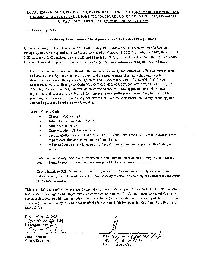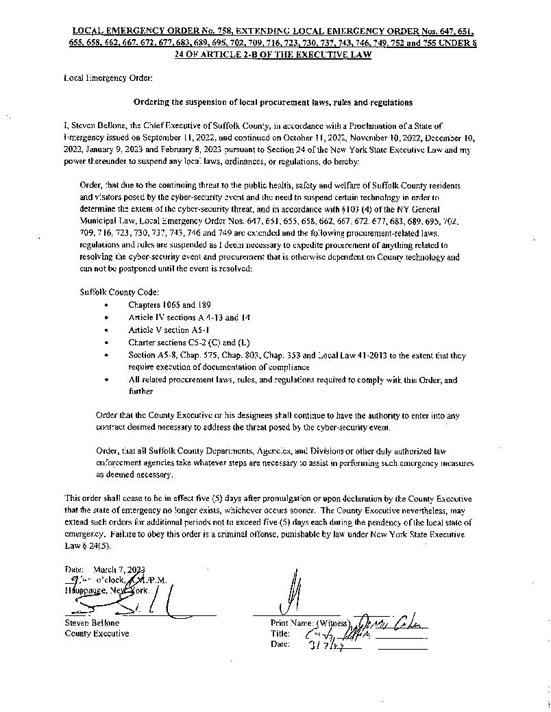Order, that due to the continuing threat to the public health, safety and welfare of Suffolk County residents and visitors posed by the cyber-security event and the need to suspend certain technology in order to determine the extent of the cyber-security threat, and in accordance with §103 (4) of the NY General Municipal Law, Local Emergency Order Nos. 647, 651, 655, 658, 662, 667, 672, 677, 683, 689, 695, 702, 709, 716, 723, 730, 737, 743, 746 and 749 are extended and the following procurement-related laws, regulations and rules are suspended as I deem necessary to expedite procurement of anything related to resolving the cyber-security event and procurement that is otherwise dependent on County technology and can not be postponed until the event is resolved: