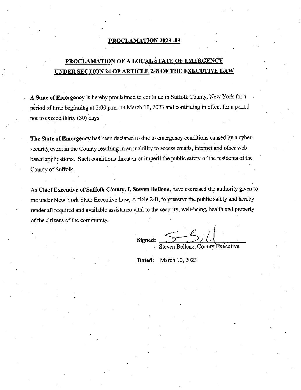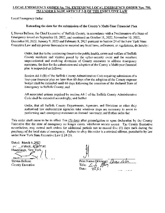 I, Steven Bellone, the Chief Executive of Suffolk County, in accordance with a Proclamation of a State of Emergency issued on September 11, 2022, and continued on October 11, 2022, November 10, 2022, December 10, 2022, January 9, 2023, February 8, 2023 and March 10, 2023 pursuant to Section 24 of the New York State Executive Law and Order, that due to the continuing threat to the public health, safety and welfare of Suffolk County residents and visitors posed by the cyber-security event and the resultant unprecedented and evolving diversion of the County resources to address emergency measures, the date for the submission and adoption of the County’s Multi-year financial