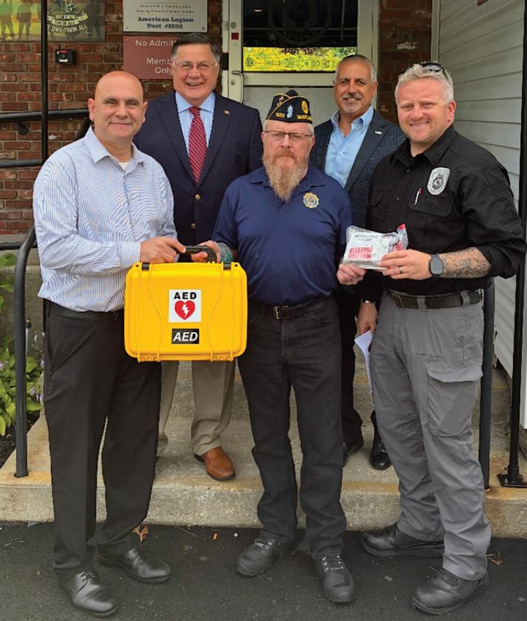 Officials from Suffolk County Fire Rescue and Emergency Services (FRES), along with Legislator Jim Mazzarella and County Executive Ed Romaine, presented an Automated External Defibrillator (AED) to the local post this week.