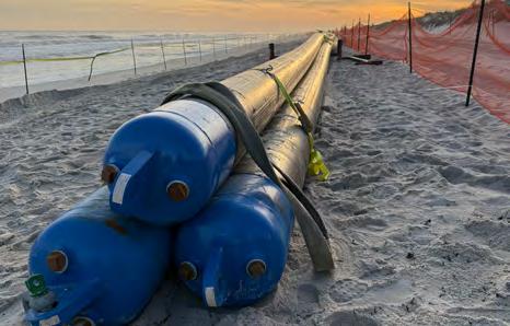 The four-wheel-drive path to the Outer Beach was rerouted through the park’s camping area to make way for the equipment. Rows of orange fencing were installed to direct traffic and keep people away from the construction zone. Workers used a mud slurry to drive the conduit hundreds of feet under the parking lot as a large offshore platform loomed on the horizon. Many onlookers were drawn to view the once-in-a-lifetime sight.