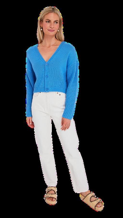 She was looking at a blue and green printed dress that had just come in. “And is that sweater part of the group? That color is divine.”
