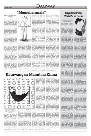 mausisa sa mga bagay-bagay. Samakatuwid, napakadali silang mabiktima ng mga misleading news, hoaxes at black propagandas lalo na tuwing kapanahunan ng eleksyon. At marahil kung bubudburan pa ng kahit kaunting rekado ang mga ipinapahayag sa social media, basta kapani-paniwala lang, kakagat at kakagat pa rin itong mga netizens o Millennials na tinatamad nang manaliksik kahit ‘yung paborito nilang kasangga na si Google ay isang pindot lang nila’t nandiyan na agad. Nahahasa ang katamaran ng kabataan kung hindi wasto ang pagkakagamit nila sa silbi ng teknolohiya. Sabi nga ni Paulynn Sicam (The Philippine Star), “Saan ba nila kinukuha ang mga delusyonal nilang mga ideya? Hindi dahil sa pagbabasa ng mga malalalim na mga artikulo dahil, sa pangkalahatan, hindi sila mahilig sa mga libro, ngunit marahil mula sa mga memes—mga larawang mensahe na nagpapasimple sa isang komplikadong ideya bilang isang kaakit-akit na biswal. Ang mga memes ay ang lengguwahe na ng kampanya ngayong araw.” Wika, sining at iba pang mga usaping “ediwow” para sa modernong henerasyon ang nais na ipagpatuloy ng hukbo ng kultura at edukasyon sa bansa upang mapuksa hangga’t maaari ang kamangmangan sa bawat isa sa atin. Ngayon, tanungin mo ang iyong sarili: Tanging isang patok na meme o usong hashtag na lang ba ang parating mag-uudyok sa kung paano ako umunawa, pumuna, lumikha, at pumili ng sarili kong mga desisyon?
