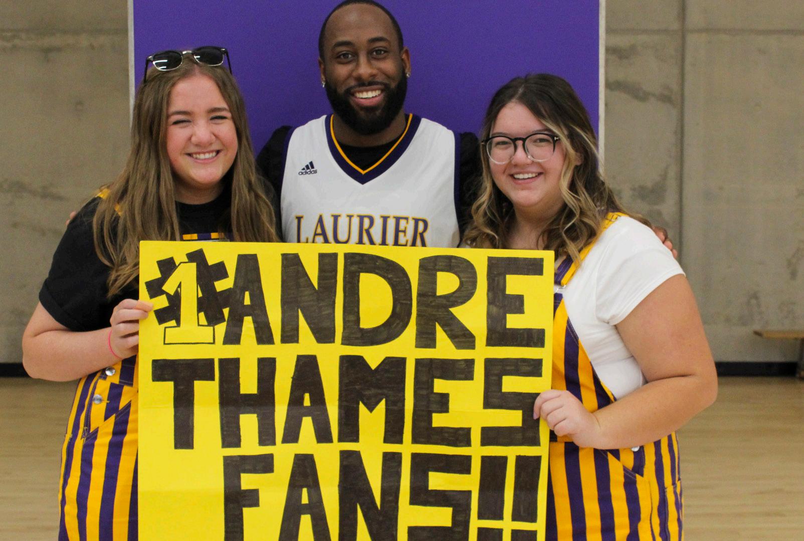 SERENA ANAGBE/SPUTNIK PHOTOGRAPHY Andre Thames, alumn, with fans and their sign at the game