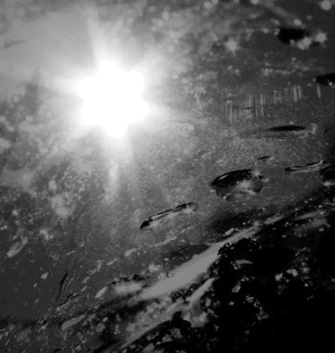 THANDO BEHBHE/CREATIVE DIRECTOR Water droplets on glass with the sun reflecting in the back.