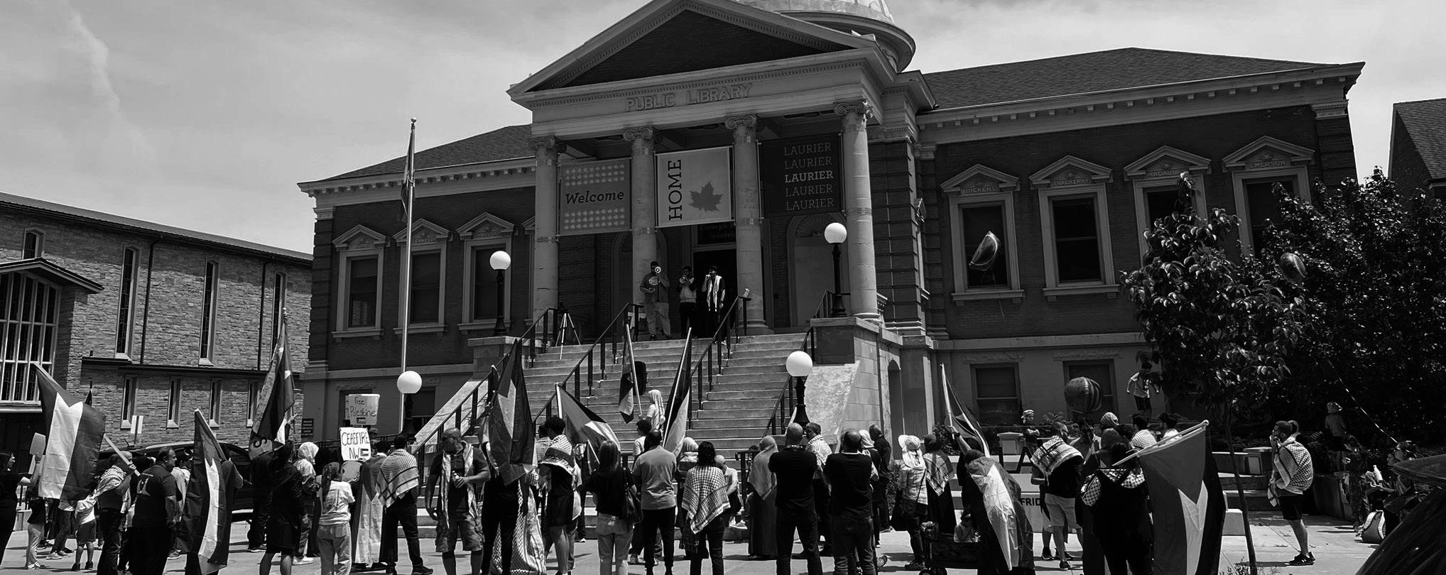 Pro-Palestinian protest in front of Laurier Brantford’s Carnegie building, locals waving flags and holding up posters.