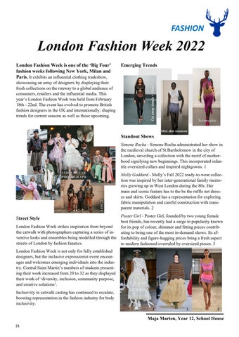 Standout Shows Simone Rocha - Simone Rocha administrated her show in the medieval church of St Bartholomew in the city of London, unveiling a collection with the motif of motherhood signifying new beginnings. This incorporated infantile oversized collars and inspired nightgowns. 1 Molly Goddard - Molly’s Fall 2022 ready-to-wear collection was inspired by her inter-generational family memories growing up in West London during the 80s. Her main and iconic feature has to the be the ruffle net dresses and skirts. Goddard has a representation for exploring fabric manipulation and careful construction with transparent materials. 2