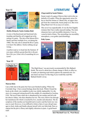 Matron Debs I am a little late to the party but I have just finished reading ‘Where the Crawdads Sing’. I have mixed feelings about this book. Whilst I found the book on the whole very readable its plot was wholly implausible. It is the story of a young girl raising herself in the middle of a marshland in Carolina, USA. The novel starts when she is abandoned by her mother and left with her abusive father, who then abandons her too. The story follows her through her tumultuous life which is touched by love, murder and education. The descriptions of the marshes are beautiful and evocative and the book was very easy to read. However, it was difficult to believe that a 6 year old girl manages to feed, clothe and finally educate herself with very little help. Pure escapism but the plot is flimsy and slightly ridiculous in parts. A good beach read! Kiri Marshall Year 12, Watt House 15