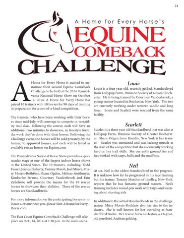 Home for Every Horse is excited to announce their second Equine Comeback Challenge to be held at the 2014 Pennsylvania National Horse Show on October 14, 2014. A Home for Every Horse has paired 10 trainers with 10 horses for 90 days of training in preparation for a one-of-a-kind competition. The trainers, who have been working with their horses since mid-July, will converge to compete in versatility trail class. Following the course, each will have an additional two minutes to showcase, in freestyle form, the work they’ve done with their horses. Following the Challenge event, the horses will be sold privately, by the trainer, to approved homes, and each will be listed as available rescue horses on Equine.com The Pennsylvania National Horse Show provides a spectacular stage at one of the largest indoor horse shows in the United States. The 10 trainers, including; Todd Feaser, Jessica Flaherty, Tammy Marsh, Joel Miner, Missy Morris-Rothfuss, Shane Ogden, Melissa Smithmyer, Kimberlee Strauss, Courtney VanderBrook and Erin Zellefrow, will provide the means for the 10 rescue horses to showcase their abilities. Three of the rescue horses are Standardbreds. For more information on the participating horses or to locate a rescue near you, please visit AHomeForEveryHorse.com. The East Coast Equine Comeback Challenge will take place on Oct., 14, 2014 at 7:30 p.m. in the main arena.