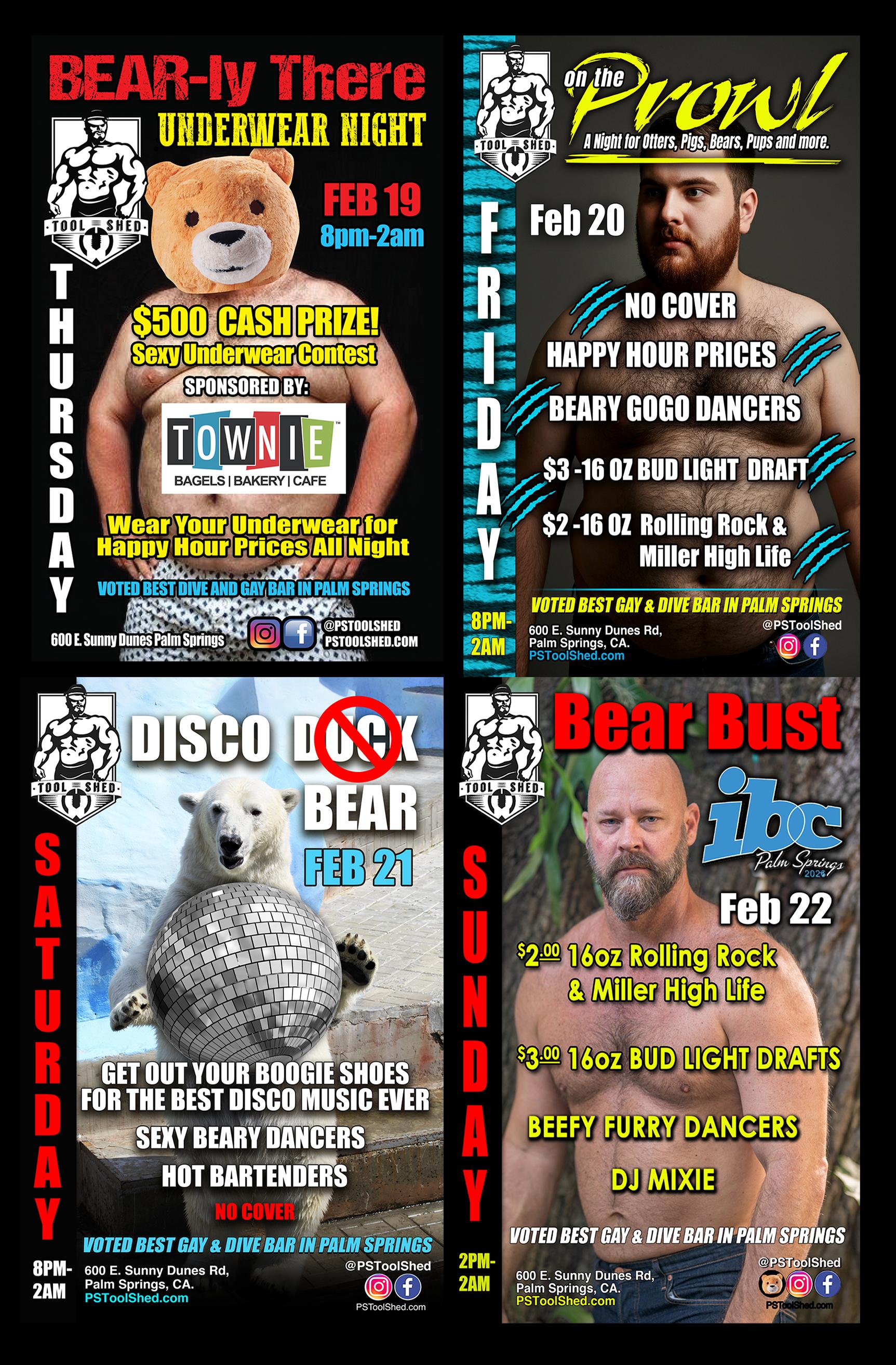 Sunday afternoon make a pit stop at Tool Shed for the Sunday “Bear” Bust. Sponsored by Tool Shed.