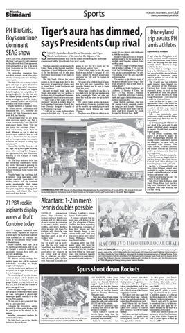 Disneyland trip awaits PH arnis athletes By Arman D. Armero IF and when the Philippines is officially declared overall champion in the 30th Southeast Asian Games, there’s no denying that our arnis martial artists deserve a huge credit for the feat. Arnis, which is making a comeback to the SEA Games since it was last played in 2005, also in Manila, completed an impressive return when it grabbed 14 out of the 20 gold medals at stake. The 14-gold haul had definitely made Senator Juan Miguel Zubiri, president of the Philippine Eskrima Kali Arnis Federation, extremely proud, so much so that he promised to treat the players and the coaches to a trip to Hong Kong Disneyland, a well-deserved reward for a job well done. Arnis did miss out in quite a few opportunities when it also settled for six silvers and two bronze medals, but overall, it did better than expected, since arnis officials initially predicted a 12-gold haul. Still, it was undoubtedly arnis’ performance which keyed the Philippines’ early surge three days into the competition. As of this posting, the Filipinos are well ahead of the pack with 51 gold medals, which had already surpassed its measly 24-gold haul overall in Kuala Lumpur. It was Dexter Bolambao, who started it all when he topped the men’s bantamweight division. His rousing victory immediately opened the floodgates for more wins, as teammates Mike Bañares, Niño Mark Talledo, Villardo Cunamay, and Jezebel Morcillo all delivered golden performances in Day 1 of the competition. Day 2 proved to be the most productive for the arnis, as Abegail Abad, Jedah Mae Soriano, Sheena del Monte, Carloyd Tejada, Elmer Manlapas and Jesfer Huquire joined the gold rush. On Day 3, Crisamuel Delfin and Mary Allin Aldeguer capped arnis’ onslaught by topping the anyo open weapon non-traditional event in both the men and women’s side. Worth mentioning too are the efforts of silver medalists. Jude Oliver Marie Rodriguez, Mark David Puzon, Ryssa Jezel Sanchez, Billy Joel Valenzuela and bronze medalists Erlin Mae Busacay and Eza Rai Yalong.