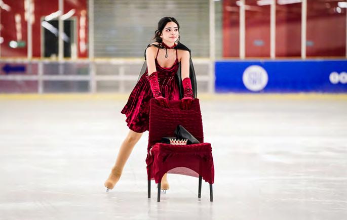 A performer dressed in crimson velvet adds theatrical flair to the ice with a dramatic number inspired by Halloween tales