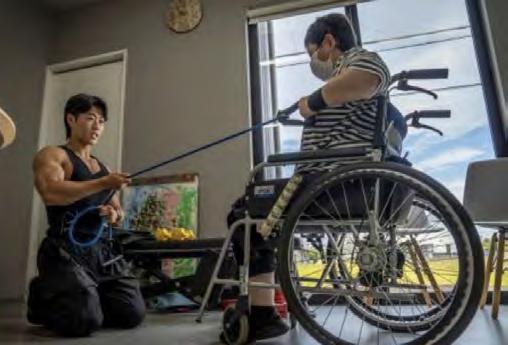 MUSCLES bulging, bodybuilder Takuya Usui settles a woman into her wheelchair at a Japanese care home, where jacked Gen Zers are helping to ease labor shortages in a struggling industry.