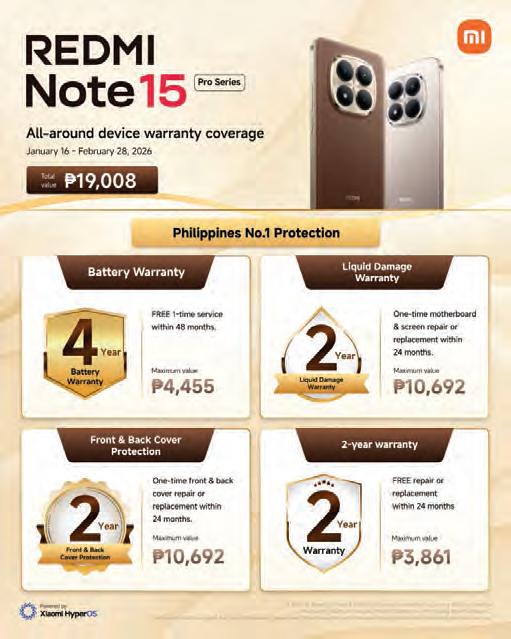 In addition, customers benefit from a twoyear one-time liquid damage and exterior protection warranty, which covers either motherboard and screen repair or replacement due to accidental spills, as well as front and back cover repair or replacement in the event of external damage. By consolidating these benefits into a single one-time claim, Xiaomi ensures that users are protected against the most common and costly accidents. Finally, a two-year standard warranty offers free repair or replacement for essential device issues, rounding out the total ₱19,008 value of coverage.