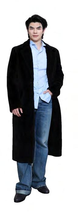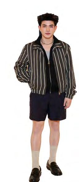Thai actors Apo Nattawin, Mile Phakphum, and Fourth Nattawat Apo Nattawin wore a denim-on-denim outfit that combined casual comfort with a neat structure. Mile Phakphum enhanced the denim look with a dark indigo double-breasted blazer featuring peak lapels and metallic buttons, designed like formal suits. Fourth Nattawat opted for a fun and lively style at Louis Vuitton, wearing a gray top with a navy zip-up and a brown jacket with stripes, paired with black tailored shorts. His outfit included khaki socks that reached mid-calf, black loafers, and accessories made of metallic pearls. This look introduced a fresh take on seasonal fashion.