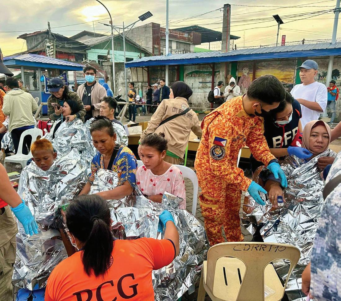SEA TRAGEDY. Survivors wrapped in thermal wear, left photo, are interviewed after their rescue at sea, right photo, yesterday by Coast Guard personnel in Basilan. Philippine Coast Guard