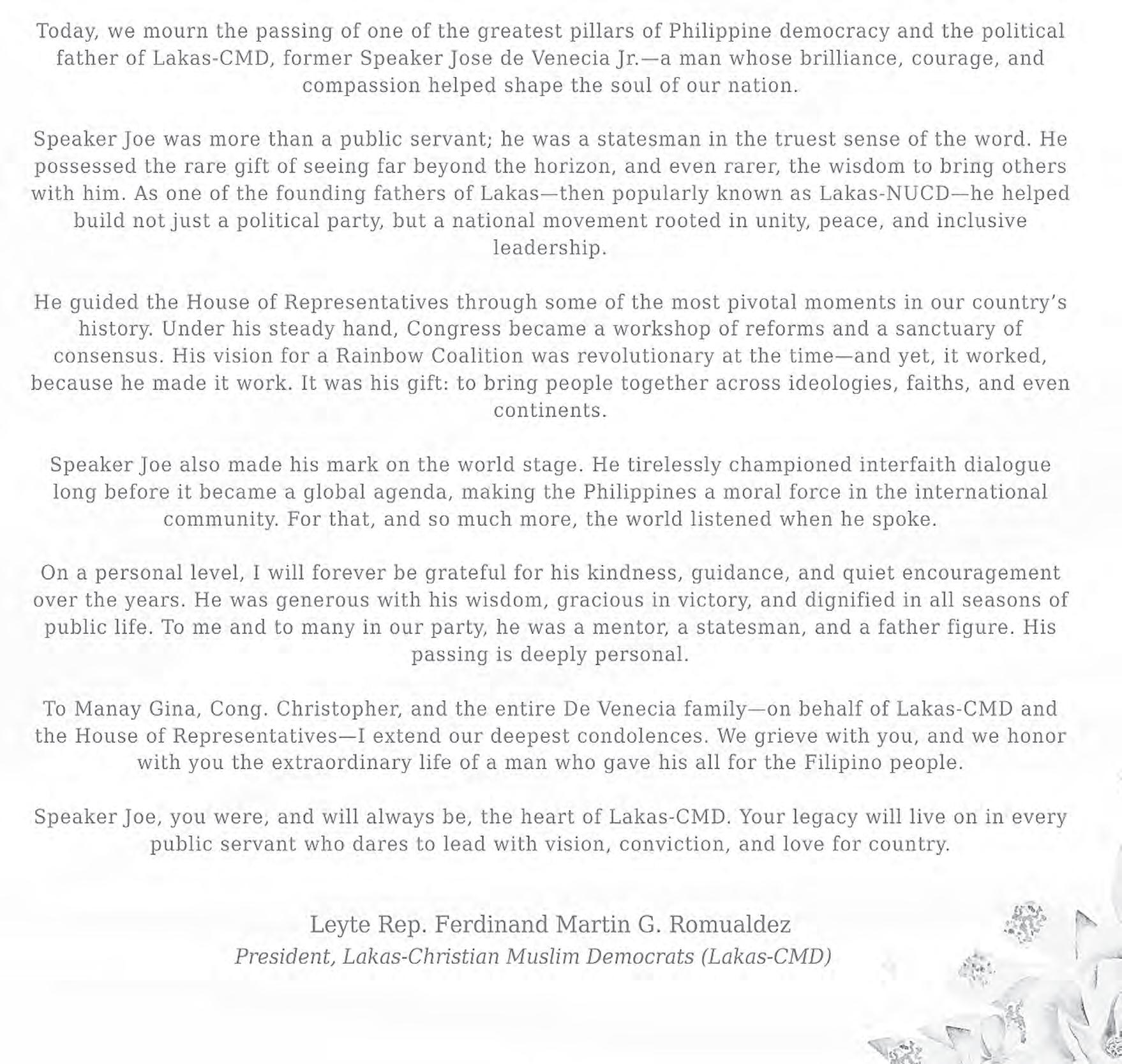 "Speaker Joe was more than a public servant; he was a statesman in the truest sense of the word. He possessed the rare gift of seeing far beyond the horizon, and even rarer, the wisdom to bring others with him,” said Romualdez, the incumbent president of Lakas-CMD.