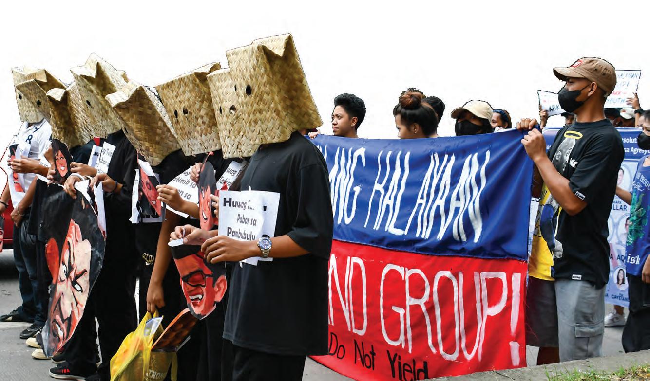 UNYIELDING. With their heads covered in bayongs, members of the Filipinos Do Not Yield Movement, together with representatives from the Alyansa Bantay Kapayapaan at Demokrasya and the People’s Alliance of Democracy and Reforms, lead a rally outside the Senate to express support for Senate Resolution No. 37 condemning the statements of the Embassy of China in the Philippines against Philippine officials and institutions. Norman Cruz