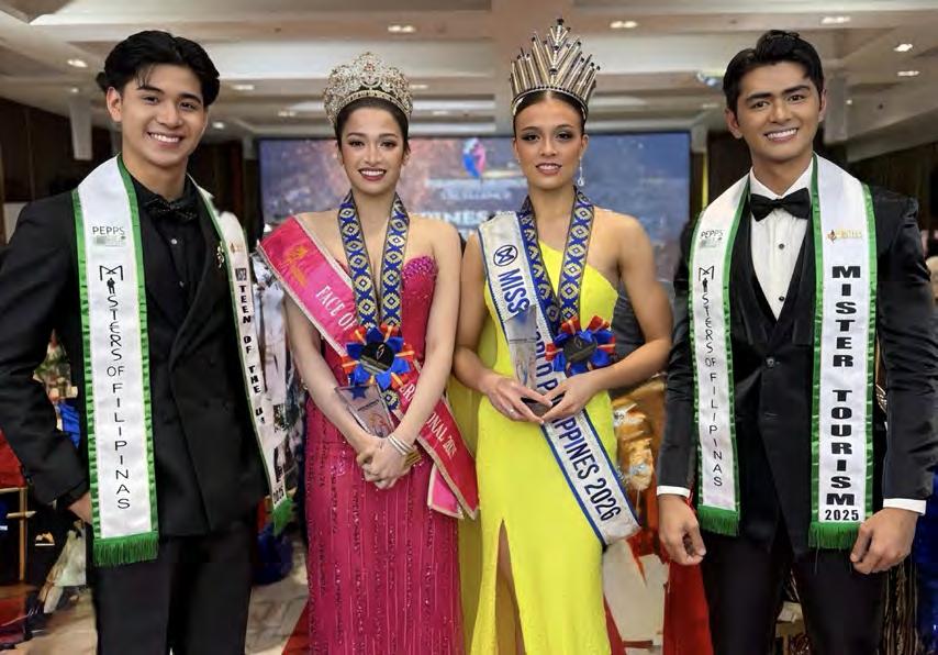 From left: Mister of Filipinas - Mister Teen of the Universe Philippines 2026 Calix Esguerra, Face of Beauty International 2025 Nikki Buenafe, Distinct Male and Female Pageant Winner of the Year Miss World Philippines 2026 Asia Rose Simpson, and Mister of Filipinas 2026 –Tourism John Hipolito