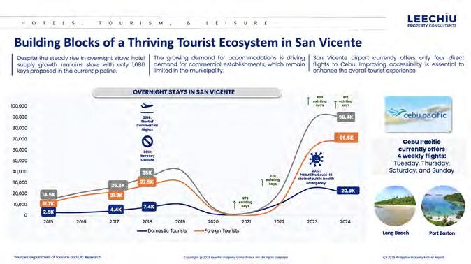 A Stopover, Not Yet a Destination According to research by Leechiu Property Consultants, San Vicente welcomed over 90,400 overnight visitors in 2023, including 69,500 foreign tourists and just 20,900 domestic travelers. This imbalance shows that San Vicente has not yet evolved into a true destination—it currently serves more as a stopover. Many local tourists use the town as a convenient break on the five-hour land journey between Puerto Princesa and El Nido. Still, the relatively low number of domestic visitors represents a significant opportunity. The Philippine tourism industry has long been anchored by local travelers, and San Vicente’s low domestic penetration points to a large, untapped market that could drive its next phase of growth.