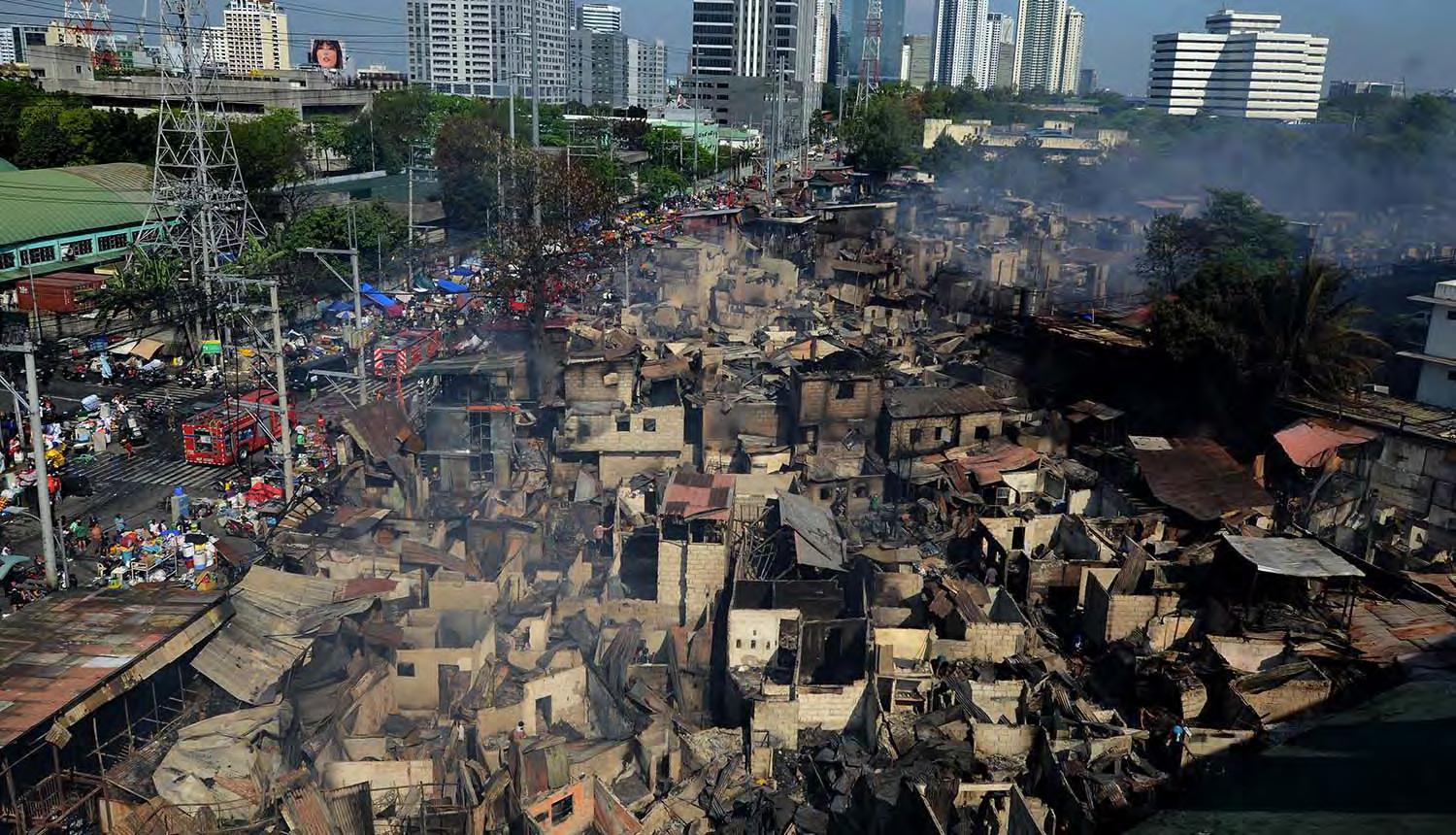 AT least 970 families are temporarily staying in evacuation centers after a fire hit a residential area along NIA Road in Barangay Pinyahan, Quezon City.