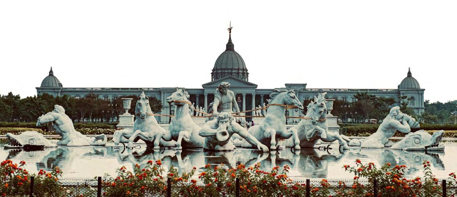 The approach to the museum adds to the sense of drama. Visitors walk through landscaped gardens and pass statues and water features that guide them toward the building. Before reaching the entrance, they cross the Olympus Bridge, a broad walkway lined with sculptures inspired by Greek mythology. Figures of gods and heroes stand on both sides, creating a ceremonial path toward the museum.