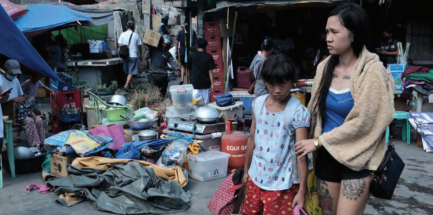 HOMELESS. A mother and daughter leave with their belongings before the demolition of the firehit homes yesterday at NIA Road, Barangay Pinyahan, in Quezon City. Manny Palmero