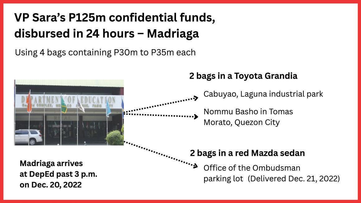 He said on December 20, 2022, four bags of cash, each allegedly containing between P30 million and P35 million, were taken from the Department of Education central office in Pasig City and delivered to various destinations, including Laguna and Quezon City.