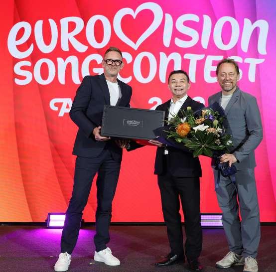 Martin Green (left) presents the Eurovision Song Contest Asia 2026 trophy to Chuwit Sirivajjakul (center) for safekeeping for host city Bangkok, with Peter Settman (right)