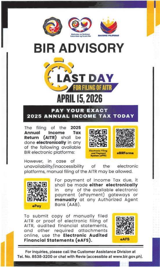 PRESIDENT Ferdinand Marcos Jr. on Tuesday announced the extension of the deadline for filing 2025 Annual Income Tax Returns (AITR)