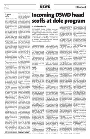 Corazon Soliman, insisted that Congress should pass a bill to institutionalize the 4Ps or the Conditional Cash Transfer program, which started in 2008, before President Benigno Aquino III steps down. During an economic forum earlier this week, businessmen recommended the “review of the Conditional Cash Transfer program,” which Duterte had repeatedly promised to continue and even expand during the campaign. The program currently benefits 4.6 million poor households. But forum participants criticized the program for promoting “dependency on government.” A total of P62.7 billion was allocated by the government for the scheme, which is enough to cover 4.6 million households this year. Duterte said he will draw funds from sin taxes and the Philippine Amusement Gaming Corp. to bankroll his expanded 4Ps program. candidates that were nominated by political parties, Aksyon Demokratiko and Pwersa ng Masang Pilipino, who also failed to file their SOCEs. The four commissioners who voted for extending the deadline are Arthur Lim, Sheriff Abas, Al Parreno, and Rowena Guanzon. Lawmakers on Thursday rallied behind efforts of certain groups, including the Partido Demokratiko PilipinoLakas ng Bayan (PDP–Laban) of President-elect Rodrigo Duterte, to question the legality of the Comelec extension. Reps. Terry Ridon and Sarah Elago of Kabataan party-list and Harry Roque of Kabayan partylist also agreed with the statement of incoming Speaker Pantaleon Alvarez that the Comelec violated laws when it bent the rules to suit the LP and Roxas. “Speaker Alvarez is correct. The extension was nothing but special treatment for the Liberal Party and Mar Roxas. We hope the Supreme Court wll reverse the Comelec the soonest,” Ridon said. Roque, a human rights lawyer, said there was no doubt that the LP-dominated Comelec favored Roxas at the expense of the law. “Majority of Comelec is very close to Mar. I think that’s why they extended the deadline— to accommodate him,” Roque said. Elago said that Comelec officials concerned must be held accountable for violations of Republic Act 7166 and Comelec Resolution 9991. “The Comelec is clearly a tool of Aquino, Roxas and their clique. They can’t bend the rules in their favor just because they’re the party in power. Shame on those commissioners who voted in favor of the extension,” Elago said.
