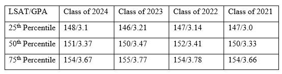 Numerical credentials for the class of 2024 remain strong. The easiest way to see that is to simply provide a chart with the LSAT and undergraduate grade point averages for the last three classes and the class of 2024: