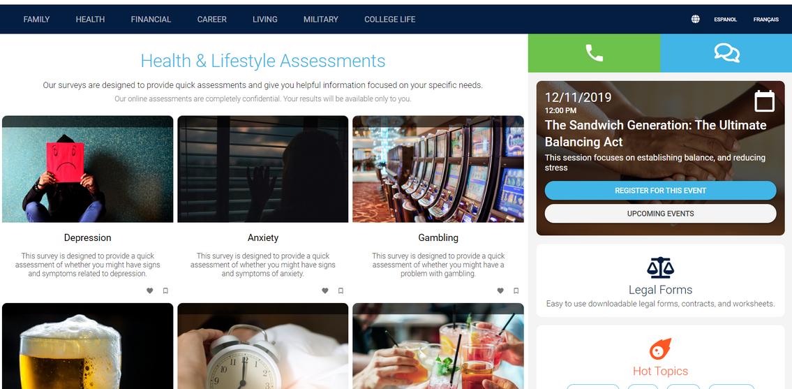 Surveys are provided to you with a quick assessment on financial, health and addiction issues. These surveys are designed to deliver targeted resources and information to meet your needs. You can save these assessments and recommendations to your profile for future use.