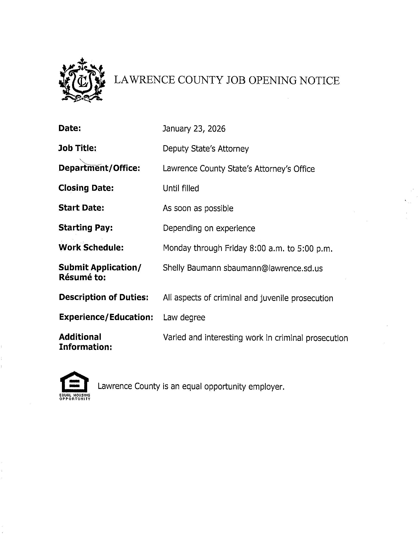 Full-time permanent position now open for a Deputy State’s Attorney in the Hughes County Office of the State’s Attorney in Pierre, South Dakota.