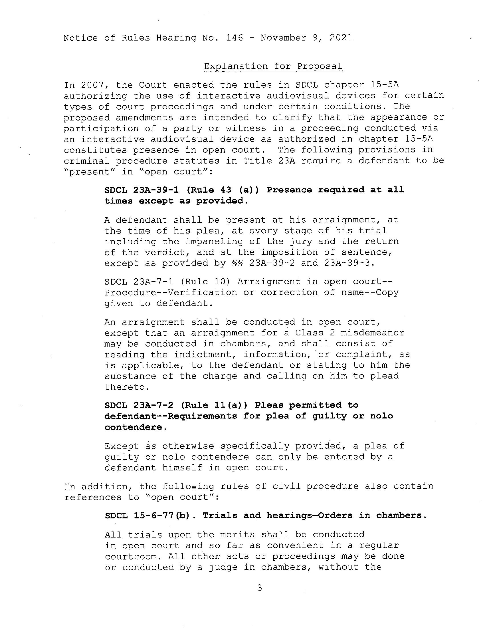 In 2007, the Court enacted the rules in SDCL chapter 15-SA authorizing the use of interactive audiovisual devices for certain types of court proceedings and under certain conditions. The proposed amendments are intended to clarify that the appearance or participation of a party or witness in a proceeding conducted via an interactive audiovisual device as authorized in chapter 15-SA constitutes presence in open court. The following provisions in criminal procedure statutes in Title 23A require a defendant to be