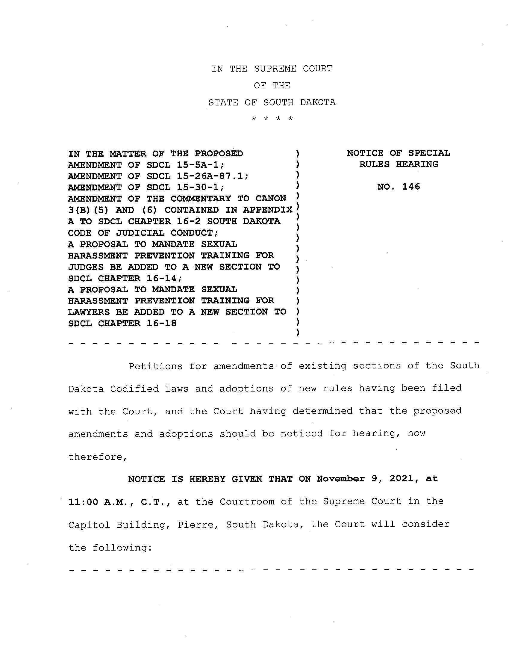 A TO SDCL CHAPTER 16-2 SOUTH DAKOTA : CODE OF JUDICIAL CONDUCT; ) A PROPOSAL TO MANDATE SEXUAL ) HARASSMENT PREVENTION TRAINING FOR ) JUDGES BE ADDED TO A NEW SECTION TO ) SDCL CHAPTER 16-14; ) A PROPOSAL TO MANDATE SEXUAL ) HARASSMENT PREVENTION TRAINING FOR ) LAWYERS BE ADDED TO A NEW SECTION TO ) SDCL CHAPTER 16-18 )
