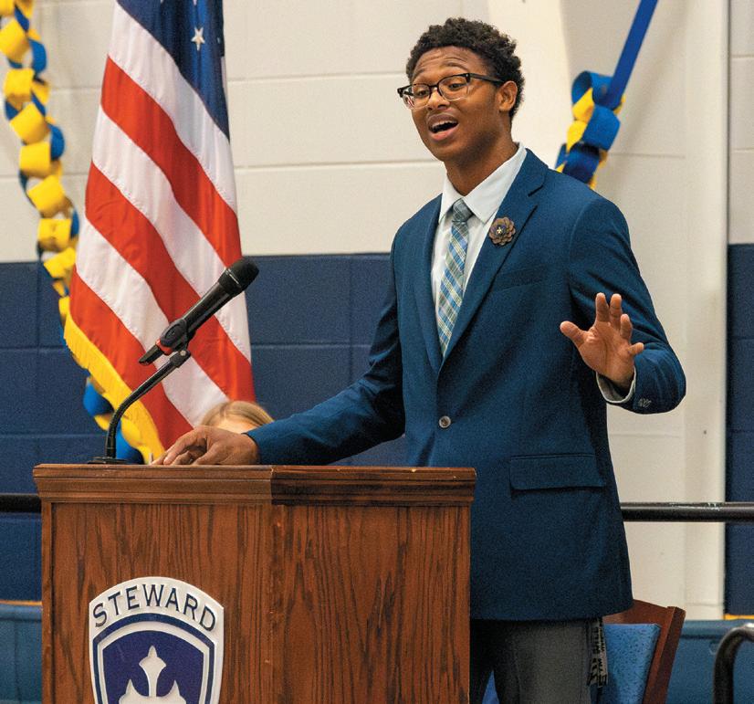 The 2024 Alumni Achievement Award, presented during Convocation, was given to Danny Welsch ’03. The award recognizes members of our alumni community who exemplify the Steward mission through inspiration, engagement, and care of others. Retired Steward art teacher Cindy Grissom presented the award, lauding Mr. Welsch for his artistic talent, commitment to serving the community, and generosity.