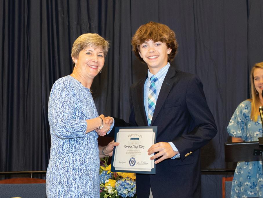 Presentation of the Class of 2023 Gift to the School Wil Berling, senior class president, presented Head of School Dan Frank with the class gift: landscaping for the entrance to the Upper School parking lot.
