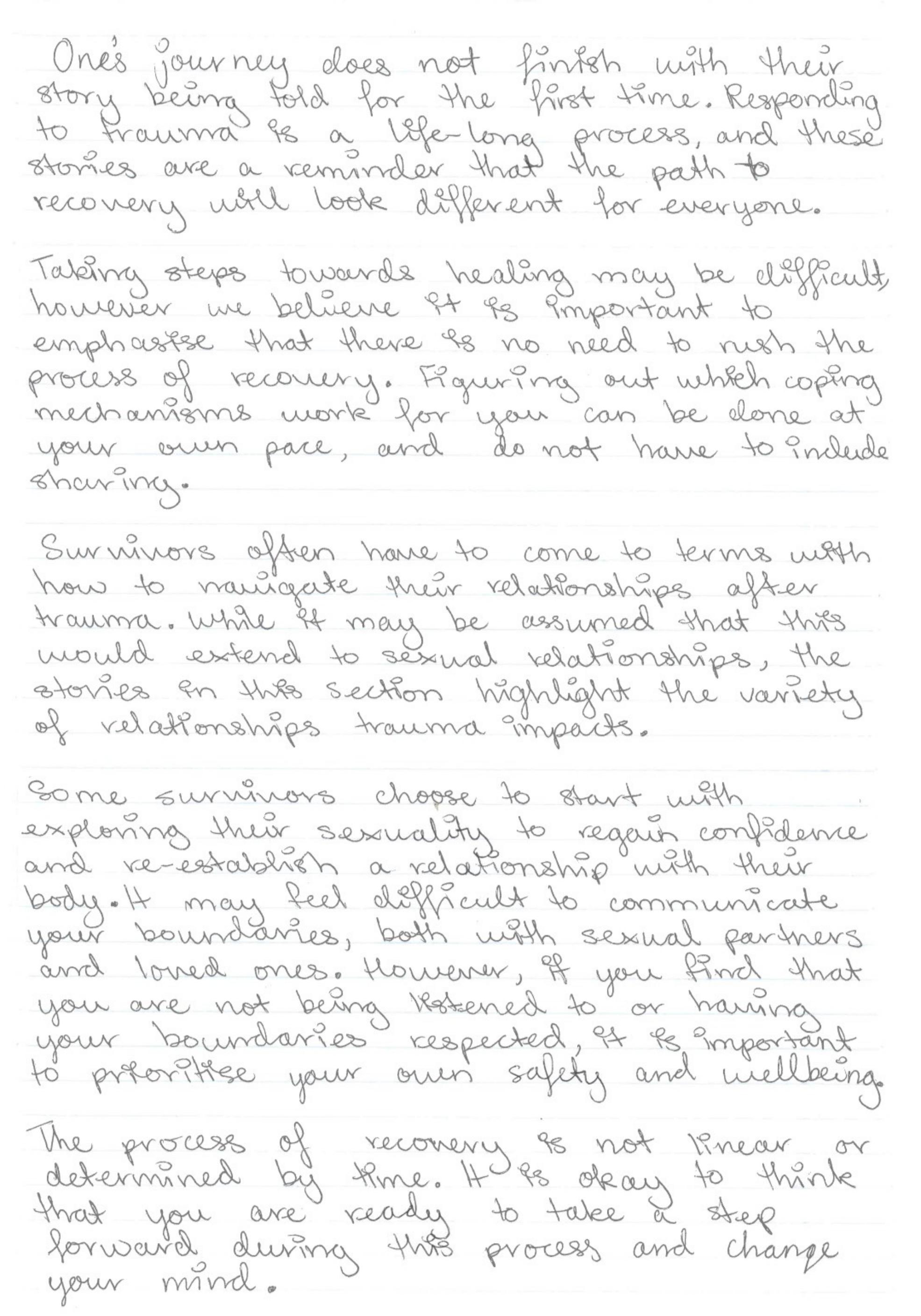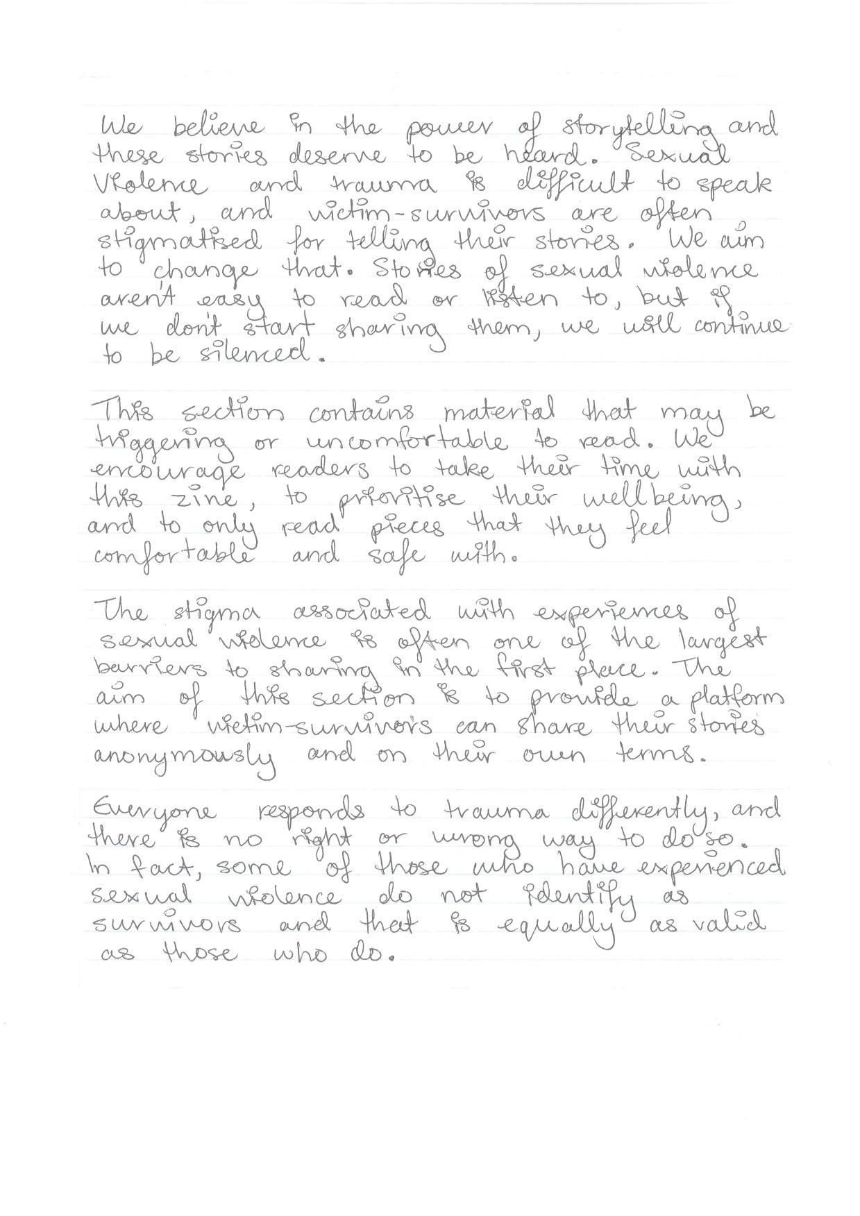 The purpose of this zine is to reveal the journey that survivors embark on in their path towards healing. We would not have been able to publish this zine without the utmost courage and bravery each writer has had in being a part of this process. We recognise that you may not feel comfortable sharing your story, and we know that some survivors will never be ready. That is okay, and no matter what, we will never stop advocating for change. We will always stand with you and we will always support you.